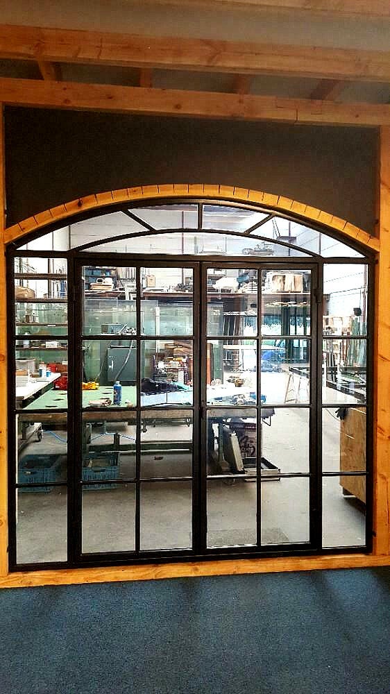 Dubbele stalen deur met een boog aan de bovenkant. Dankzij onze stalen deur krijgt jouw woon- of werkruimte een industriële touch, maar vooral een hele nieuwe uitstraling. Een stalen deur in combinatie met glas zorgt er namelijk voor dat de ruimte is afgesloten, maar dat je nog steeds alles door de deur kunt zien. Dit creëert een open ruimte-effect.